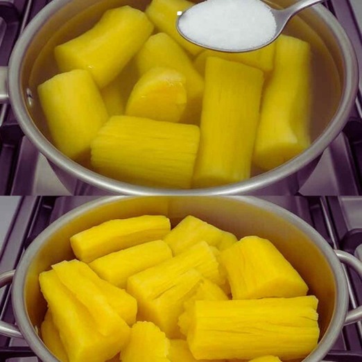 Dopo averla tagliata a pezzi (8–10 cm), noterai un filo legnoso al centro. Questo può essere rimosso prima o dopo la cottura. Se vuoi che la manioca si sfaldi, meglio toglierlo dopo, quando è tenera.