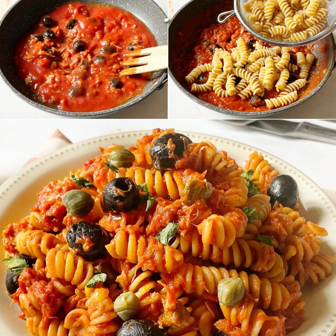 Noi abbiamo usato gli spaghetti, ma puoi scegliere il formato corto o lungo che preferisci: mezze maniche rigate, fusilli, linguine, ma anche pasta fresca, come orecchiette, cavatelli, trofie… Insieme alle olive puoi unire capperi dissalati, qualche filetto d’acciuga per una nota più sapida, sostituire la passata con i pomodorini datterini o ometterli del tutto, per una versione in bianco.