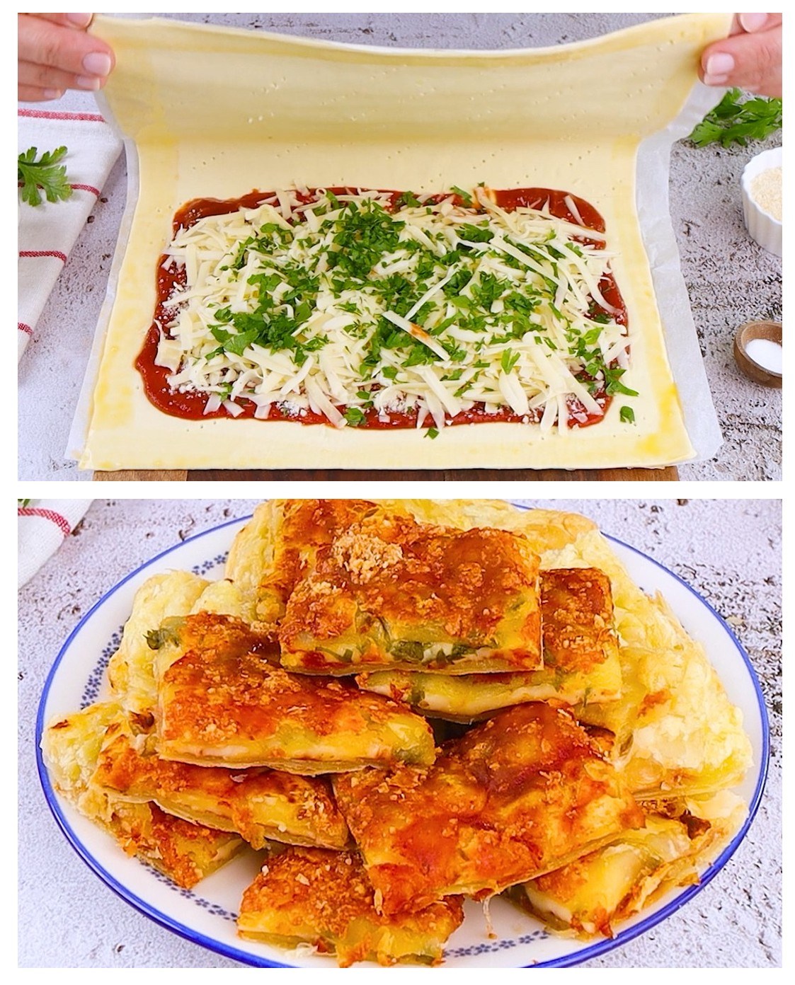Cuoci in forno preriscaldato per 15-20 minuti, finché la pasta sfoglia è dorata.